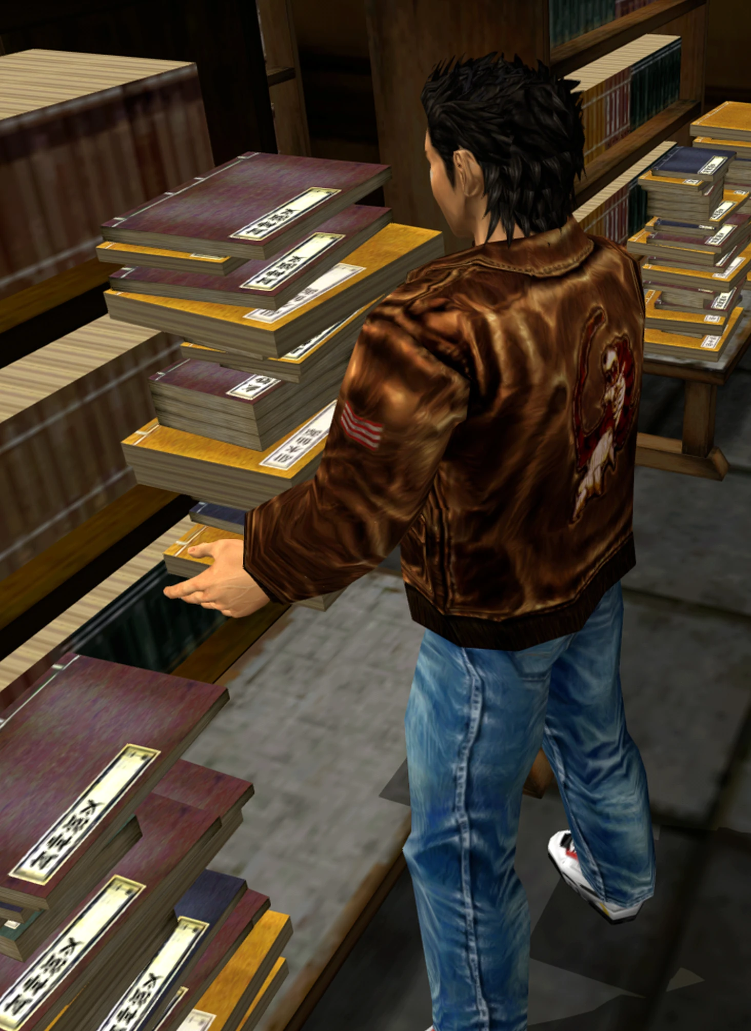 When Ryo is staying at the Da Yuan Apartments he must perform this task at the Man Mo Temple library. Ryo's task is to carry the piles of books out to the yard behind to the tables so that Jiliang Chang can lay them out to be aired.