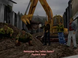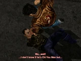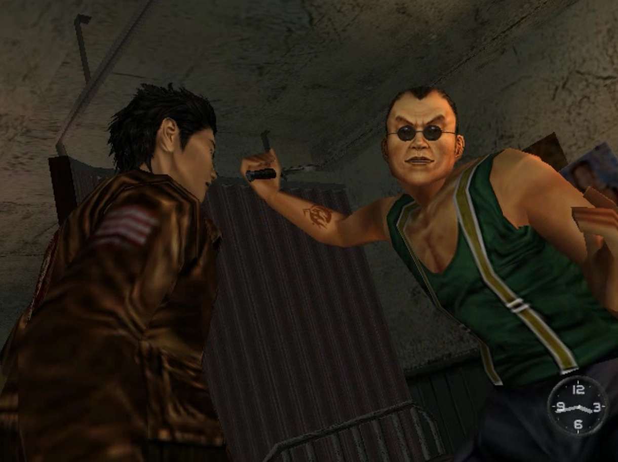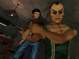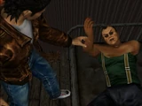 Later on, when Ryo is working at the New Yokosuka Harbor District, Charlie returns with some henchmen, riding motorcycles on the night of his fourth day of work. They attempt to run over him (Charlie and/or one other henchman can if one or both of the first two QTE's are failed), and then he jump kicks the third driver and rides his motorcycle to chase the other two throughout the harbor. Once Ryo catches up to Charlie, he orders a bunch of henchmen to throw him at the bottom of the sea. Once he defeats all of them, Charlie faces him in a one-on-one hand-to-hand fight. Ryo ends up becoming the victor and interrogates him as he tries to escape demanding to know how the Mad Angels and Chi You Men are connected. He reveals to him that a "Chinese bigshot" is leaving the harbor soon and that he already arranged a crew and ship for him. He reveals that the bigshot wears a silk robe with a dragon on it, which is Lan Di. He begs him not to tell anyone or they'll kill him.