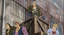 The next day, as Ryo enters Sakuragaoka, a little boy named Gaowen Xia runs to him crying and says a man with sunglasses took his soccer ball and that he would give it back if he brought him to the construction site. It was in fact Charlie who came for revenge. He orders three of his henchmen to beat him up. After Ryo beats them, Charlie holds Gaowen hostage and one of his henchmen, Minoru Okayasu, is behind Ryo with a pipe. Gaowen drops his soccer ball, so then Ryo kicks the ball into Charlie's face and knocks out the man behind him. Charlie runs away and tells him not to think he will get away with this.