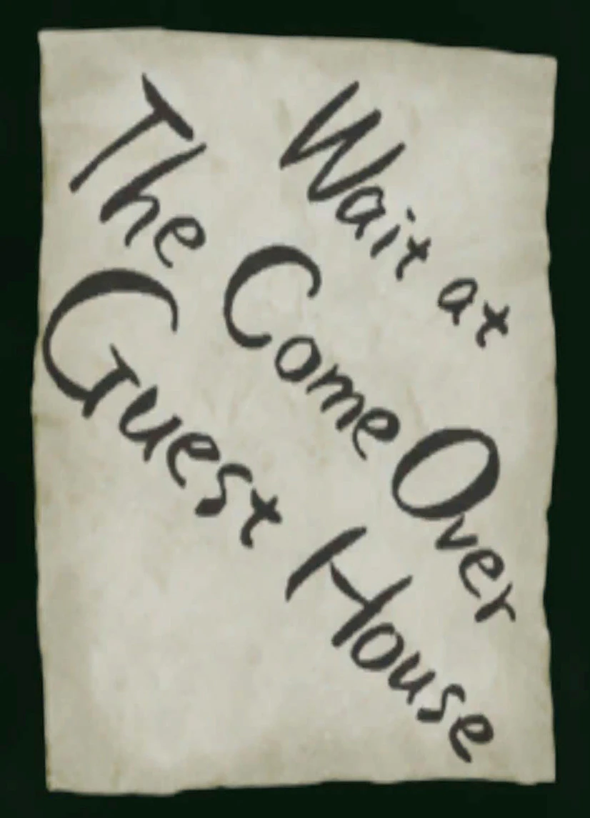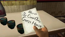 The Come Over Guest House Note (方来旅社 Fāng Lái Lǚshè) is a note that Anguo Wu or possibly another Yellow Head member gives cooks at certain restaurants to give to Ryo Hazuki in the game Shenmue II.