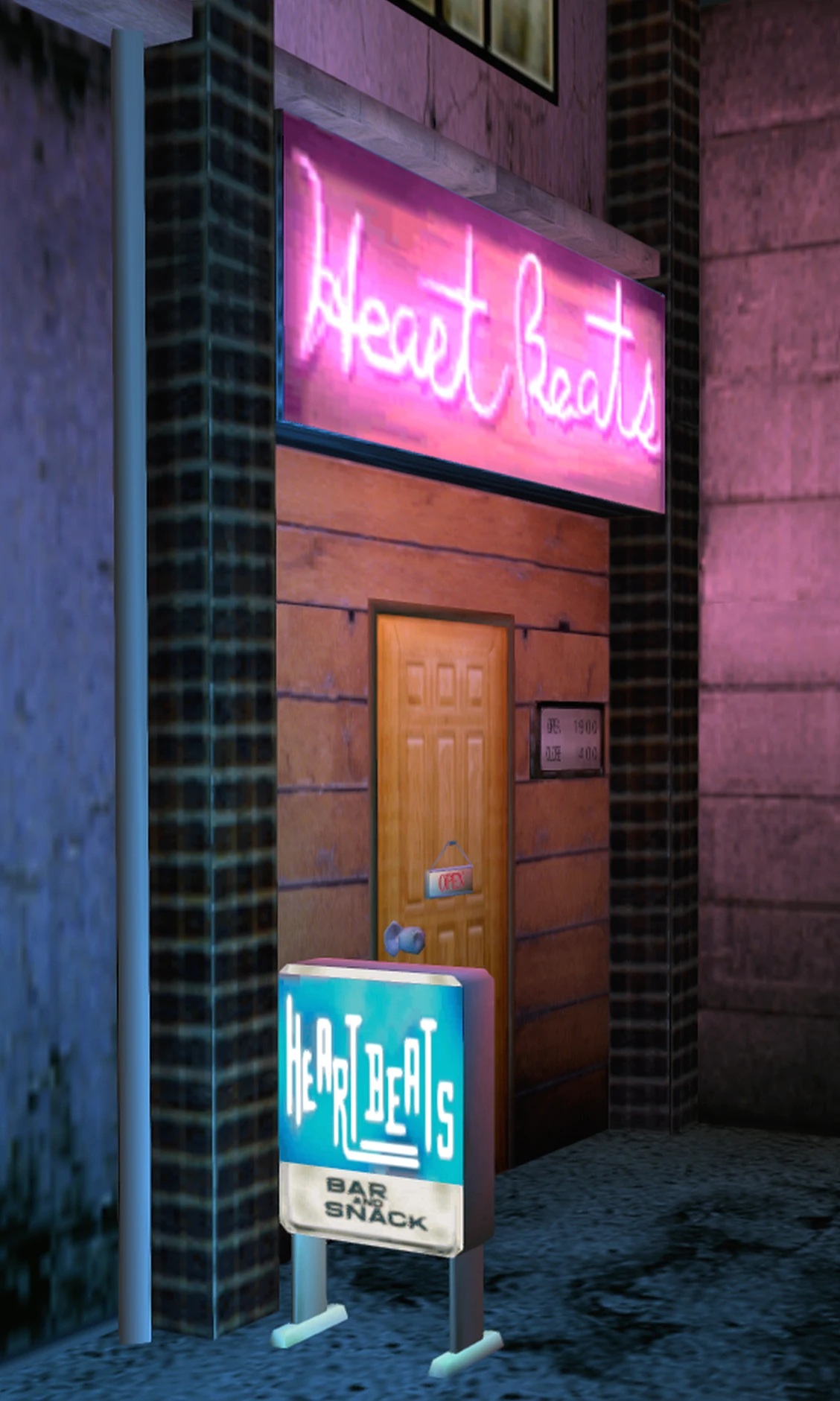 Heartbeats Bar (ハートビーツ Hātobītsu) is a shady bar down an alleyway off Dobuita, Yokosuka, Japan in the game Shenmue. The bar caters for people like gang members and thugs.
