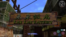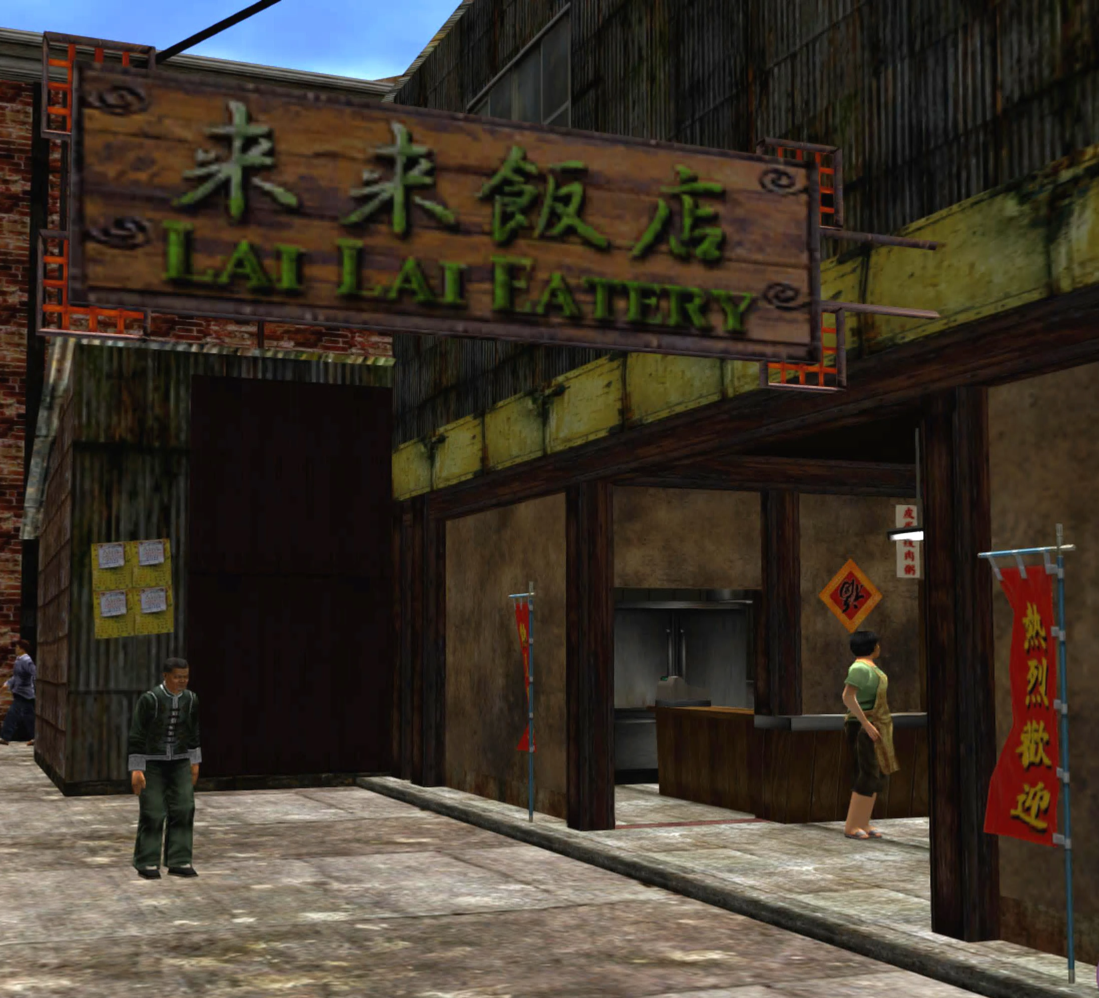 The Lai Lai Eatery (来来飯店 Lái Lái Fàndiàn) is a large open air restaurant located in an alleyway around the back of Pigeon Cafe and Bar Swing in Worker's Pier, Aberdeen, Hong Kong in the game Shenmue II. Despite it's basic look it always seems to be busy with customers. Baolai Yan works behind the counter cooking the food while his wife, Yueying Yan, and daughter, Zhenji Teng, waitress.