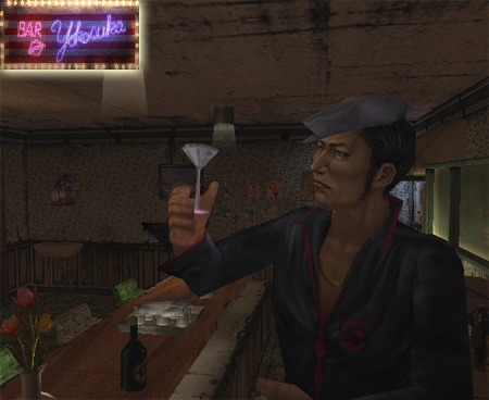 Ryo first meets Takeshi when he asks about sailors at Heartbeats bar. Takeshi puts his hand on his shoulder jokingly asking him if he is "some kind of TV detective", Ryo then throws his hand off his shoulder and tells him to back off. He then attempts to hit Ryo (and can hit him once if the first QTE is failed), but Ryo throws him over the counter knocking over everything on it, leaving him unconscious.