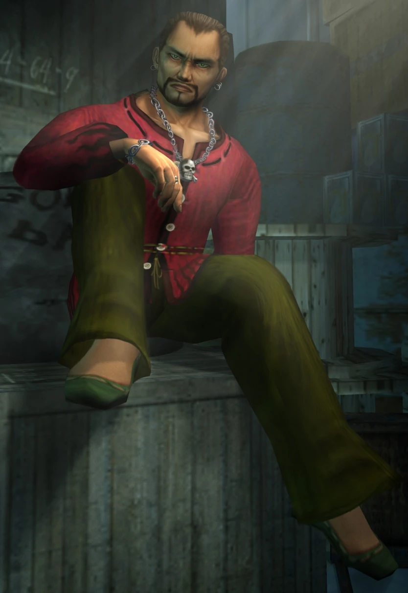 Terry is American and is 185 cm (6' 1") tall. He is white skinned, has light brown hair that's tied into a ponytail, a beard, and light green eyes. In Shenmue the Animation, his skin is darker and his eyes are a darker shade of green. He also wears a silver chained skull necklace, a red long sleeved buttoned shirt that has very dark red spots on the collar area and along the buttons, and very dark red flames on the bottom of the shirt and on the wrist area of his shirt. He wears chain bracelets on both of his wrists, and silver rings on one finger of each of his hands. He wears dark yellowish-green and bright red strings around his waist, long dark green pants, and light green sandals.