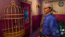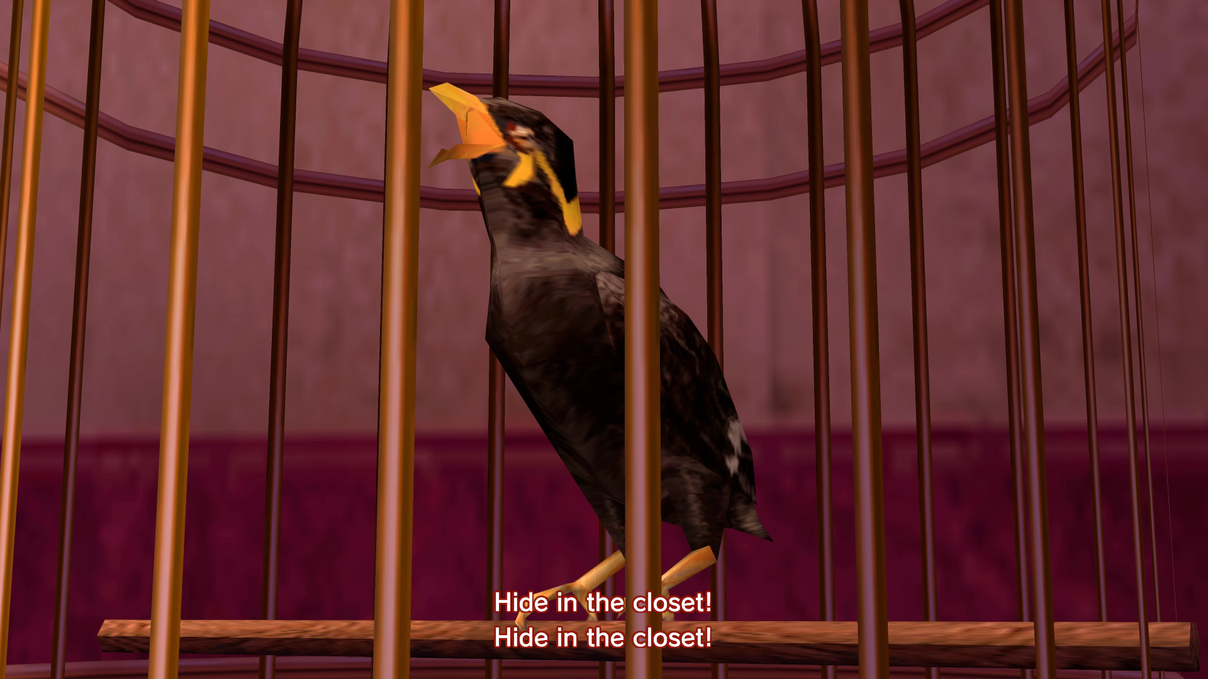 This talking myna bird (九官鳥 Kyūkanchō) is Yuan's pet. He keeps it in a cage in his room which is located on the 4th floor of the Golden Flower Building in the Stand Quarter, Kowloon, Hong Kong in the game Shenmue II.