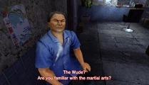 Zhangyu offers to explain the wude to Ryo Hazuki while giving his hair a trim. Explaining, as he sharpens his blade in a threatening manner, he says how those who stray are often hated by other martial artists, even killed when off guard. He then threatens Ryo with the blade to his throat but tells him not to move no matter what happens. A Quick Time Event will then appear, but the player must not press anything to succeed.